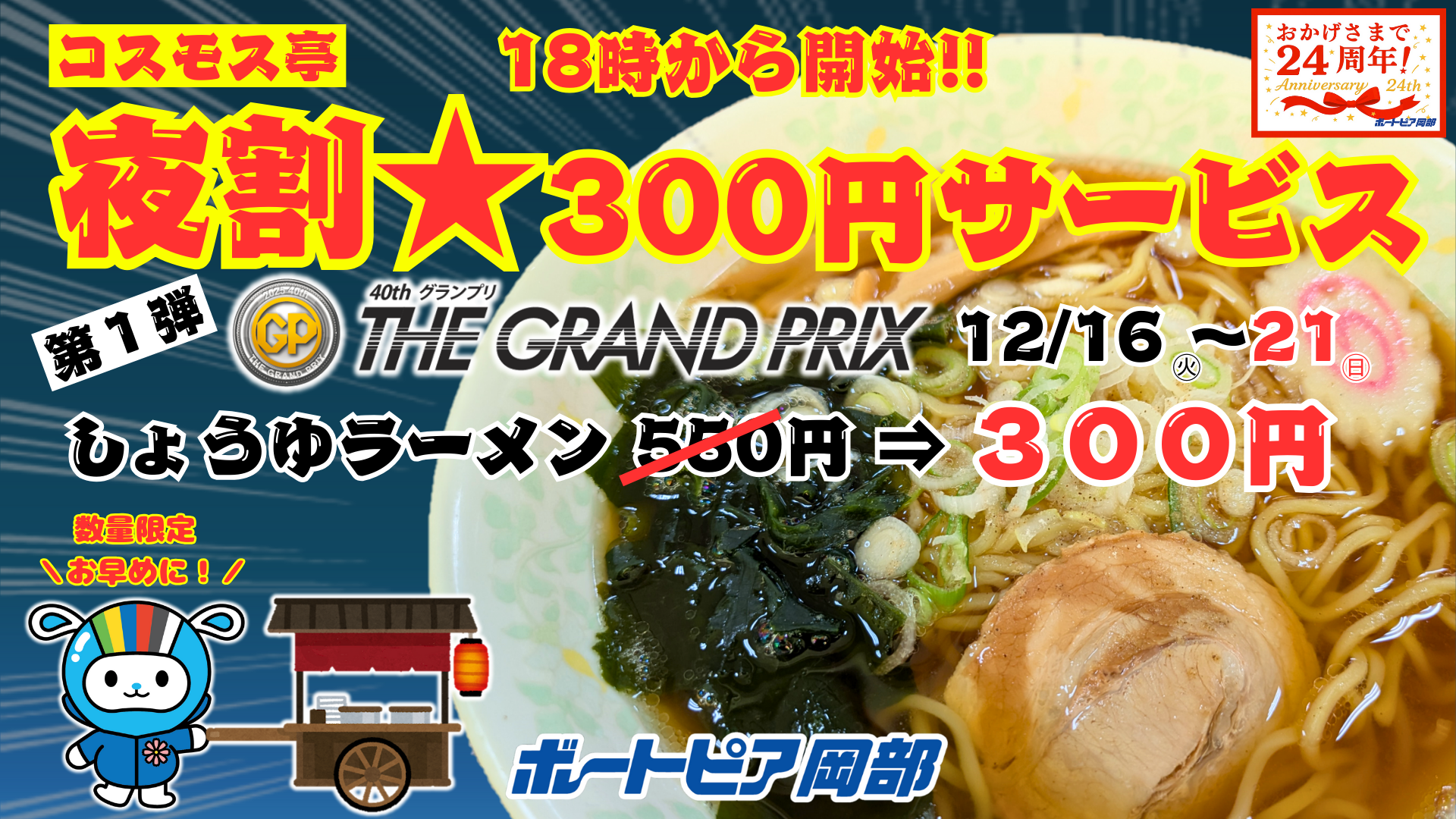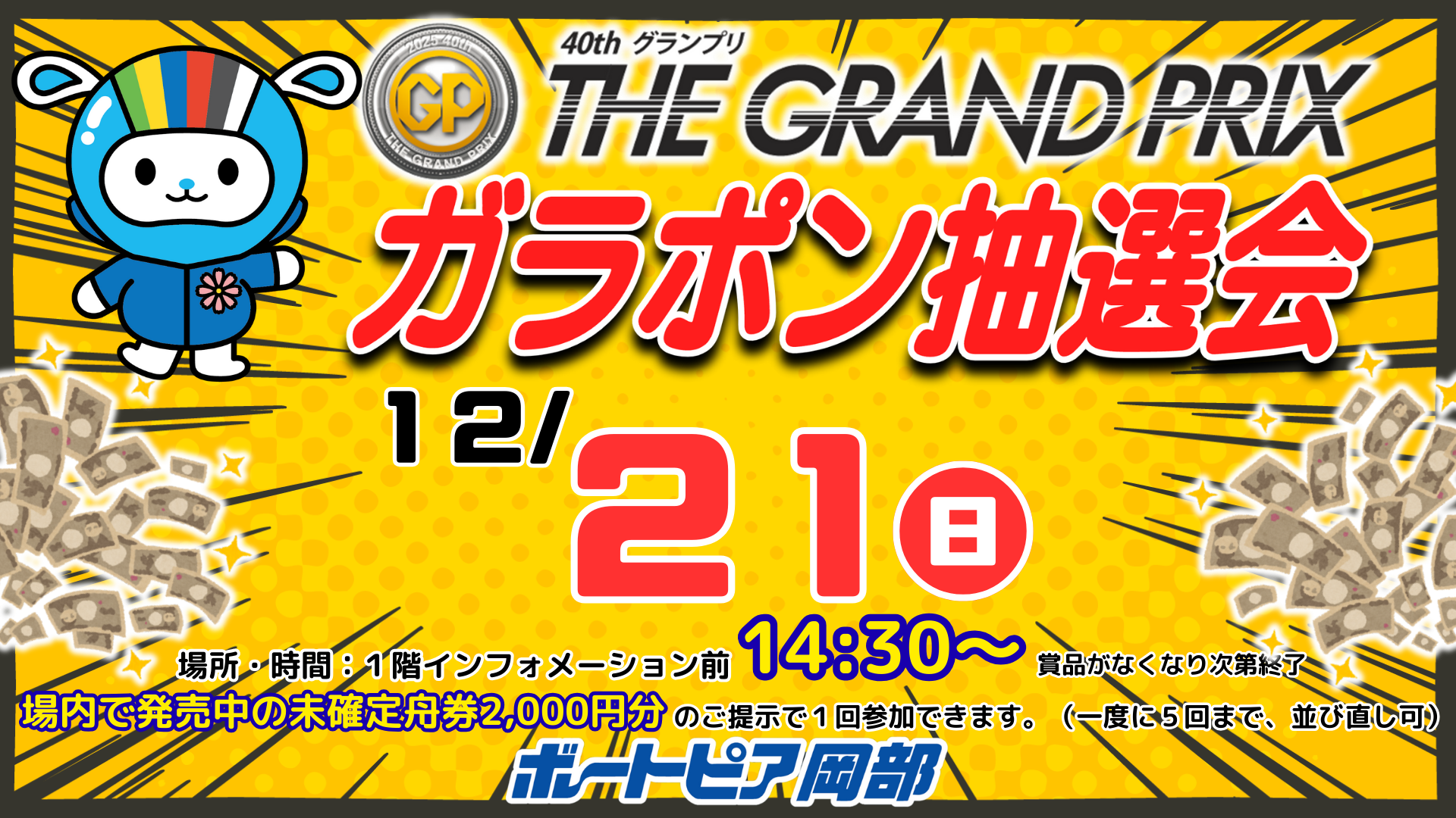 イベント・ニュース・ファンサービス一覧を見る 2025.12.13 イベント ボートピア岡部の12月は、年末3連続ガラポン抽選会まつりを開催!! 2025.12.12 ニュース 12月12日(金)BOATRACE江戸川【中止・順延】に伴う発売日程変更のお知らせ 2025.12.11 イベント 12月のSG・PGⅠ期間中は★夜割★コスモス亭300円サービスを開催します!! 2025.12.02 ファンサービス イベント 12月7日(日)ボートレース住之江 グランプリ抽選会開催! 2025.11.29 11月30日(日)&12月6日(土)「BOAT RACEカレンダー2026」プレゼント!