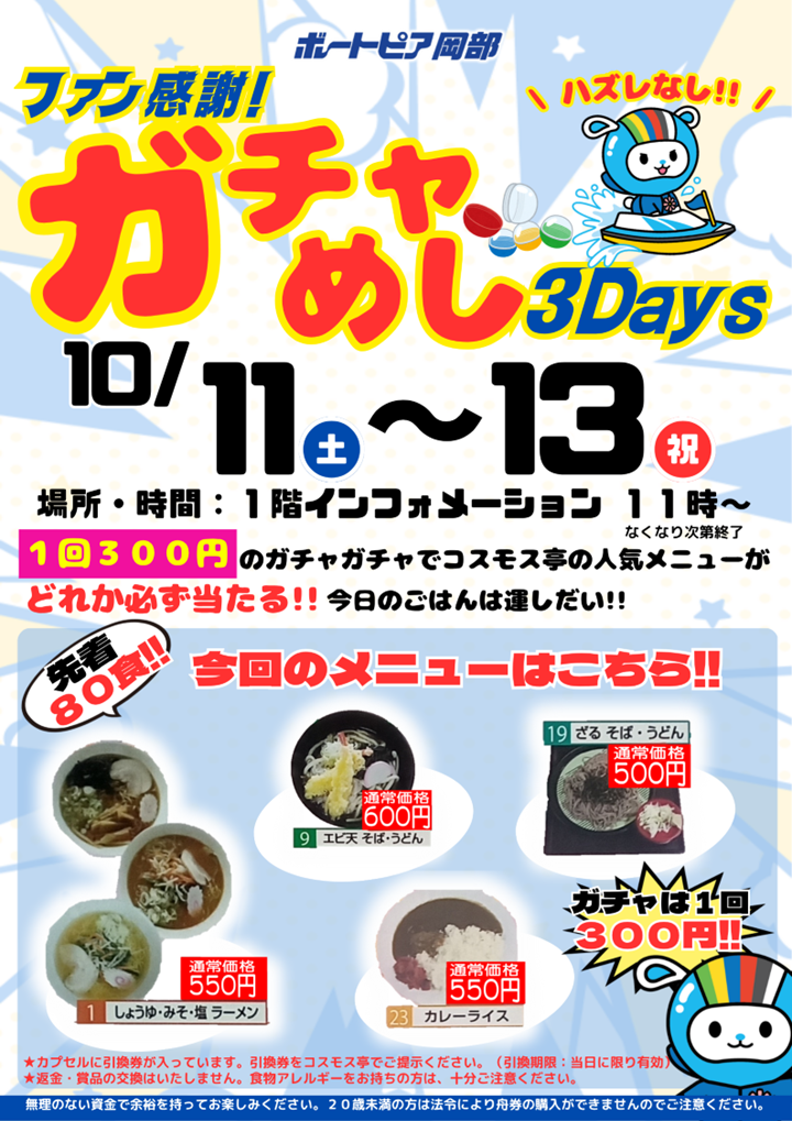 ボートピア岡部では、ファン感謝!ガチャめし 3Daysを開催します!