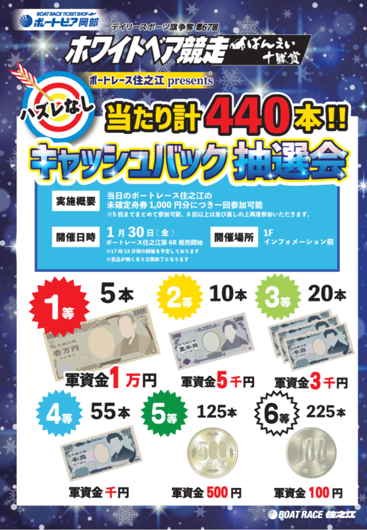 1月30日(金)BOATRACE住之江『ハズレなし!当たり計440本!!キャッシュバック抽選会』を開催!