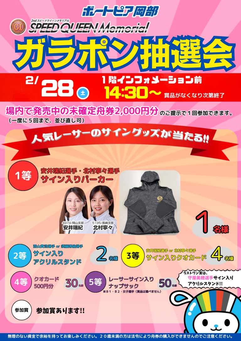 ボートピア岡部では、2月28日(土)に『PGⅠスピードクイーンメモリアルガラポン抽選会』を開催します!今回の賞品は、ボートピア岡部でしか手に入らない!?人気レーサーのサイングッズやクオカードなどが当たります!!ぜひ、ご参加ください♪♪